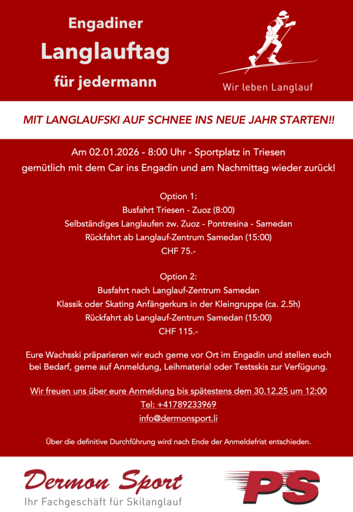 ÖFFNUNGSZEITEN ÜBER DIE FESTTAGE: Liebe Kunden vom 24.12.25 – zum 03.01.26 gelten die folgenden Öffnungszeiten: Montag-Freitag 8:00-10:00 & 16:00-19:00 Uhr Samstag 8:30-12:30. Der 24.12.25 und 31.1.25 gelten als Samstag an den Sonn- und Feiertagen haben wir geschlossen. Termine für Langlaufunttericht bieten wir gerne durchgehend auf telefonische Vereinbarung auf der Loipe in Klosters an: : +41789233969